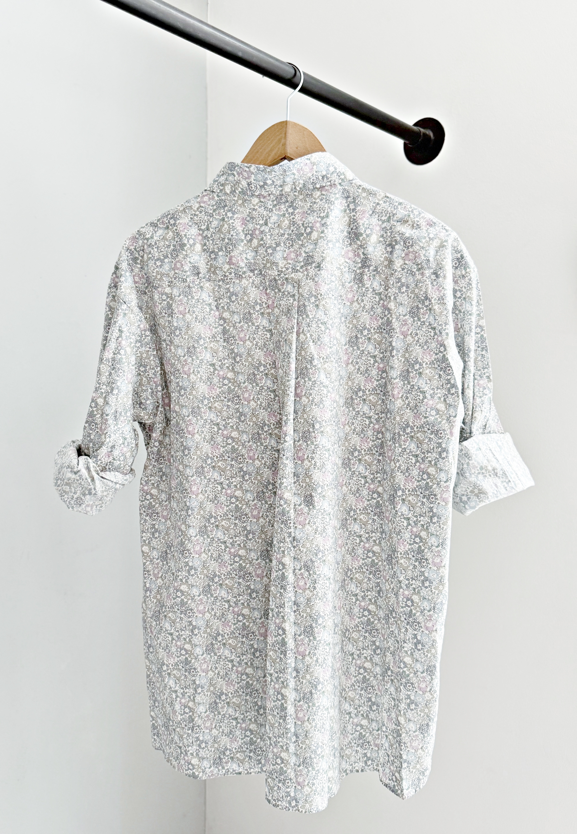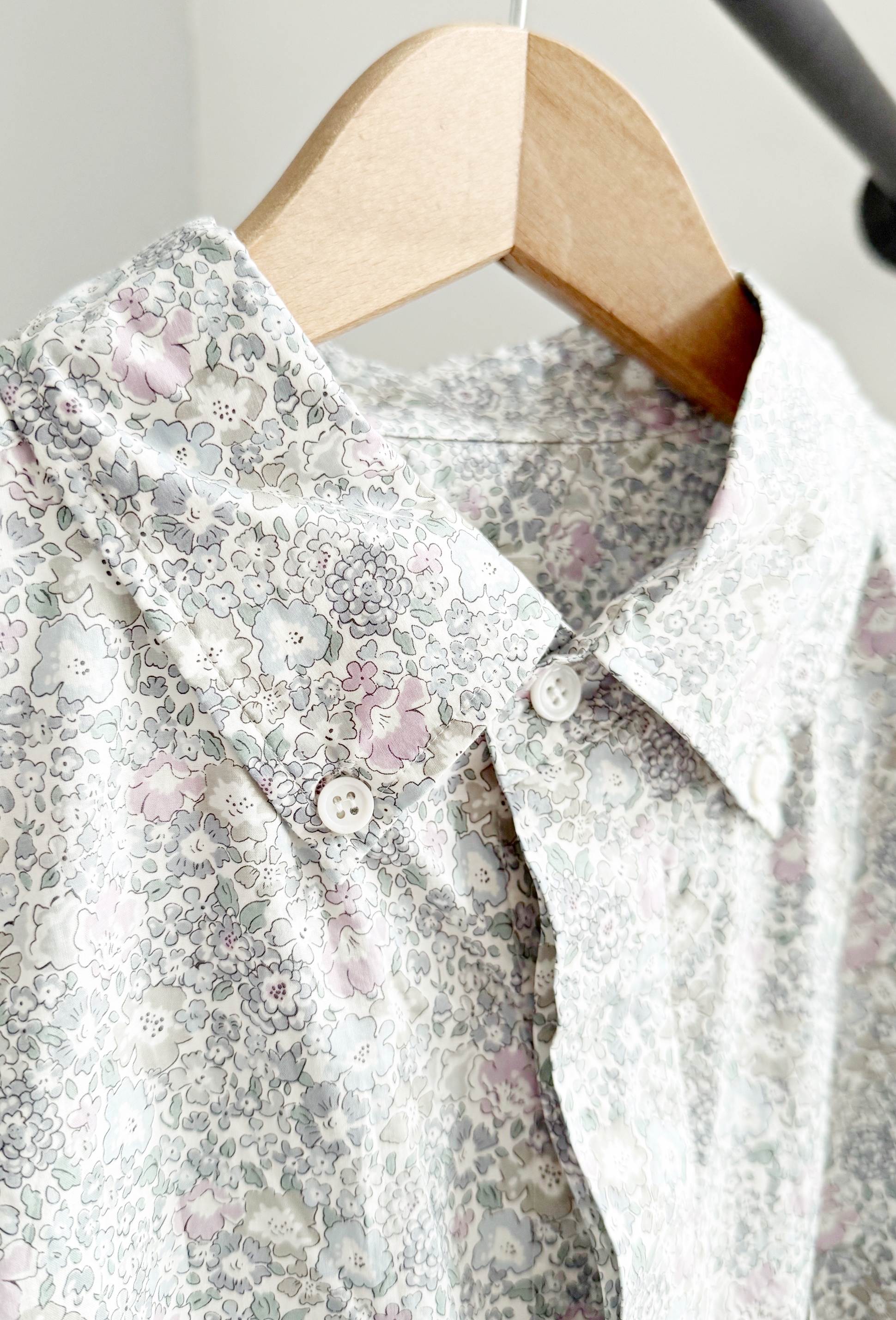 Nasz ulubiony print liberty tym razem w najpiękniejszym zestawie kolorystycznym. Róż, szary z kapką khaki ukrytej w płatkach kwiatków. Długi rękaw, kołnierzyk i mankiety zapinane na guziczki.