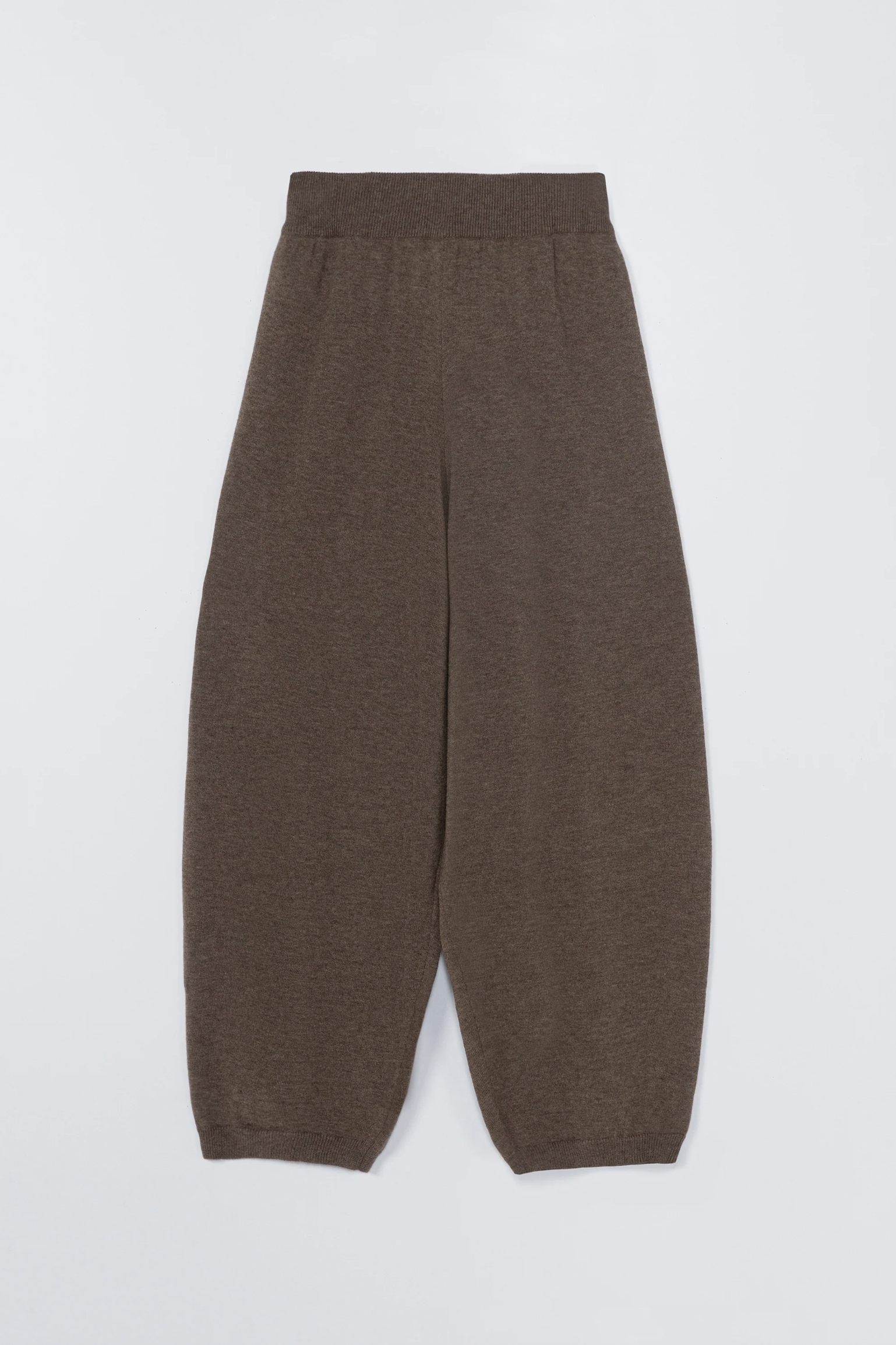 Luźny element garderoby wykonany z najdelikatniejszej wełny merynosów extrafine, zaprojektowany z zaokrąglonym kształtem nogawki i luźnym krojem. Posiada elastyczny pas i wykończenie u dołu, dzięki czemu jest miękki i wygodny, idealny do noszenia na zewnątrz i wewnątrz.