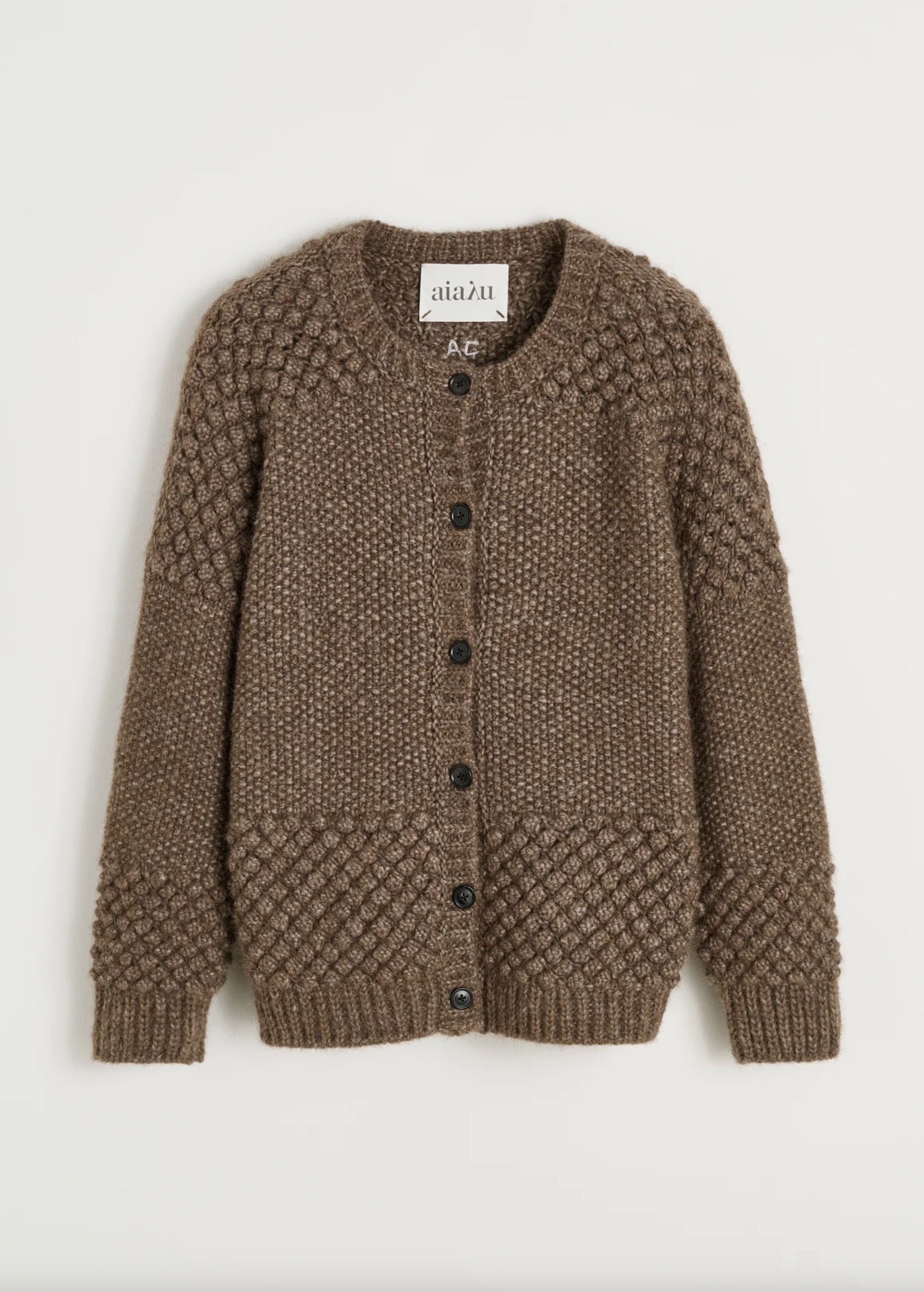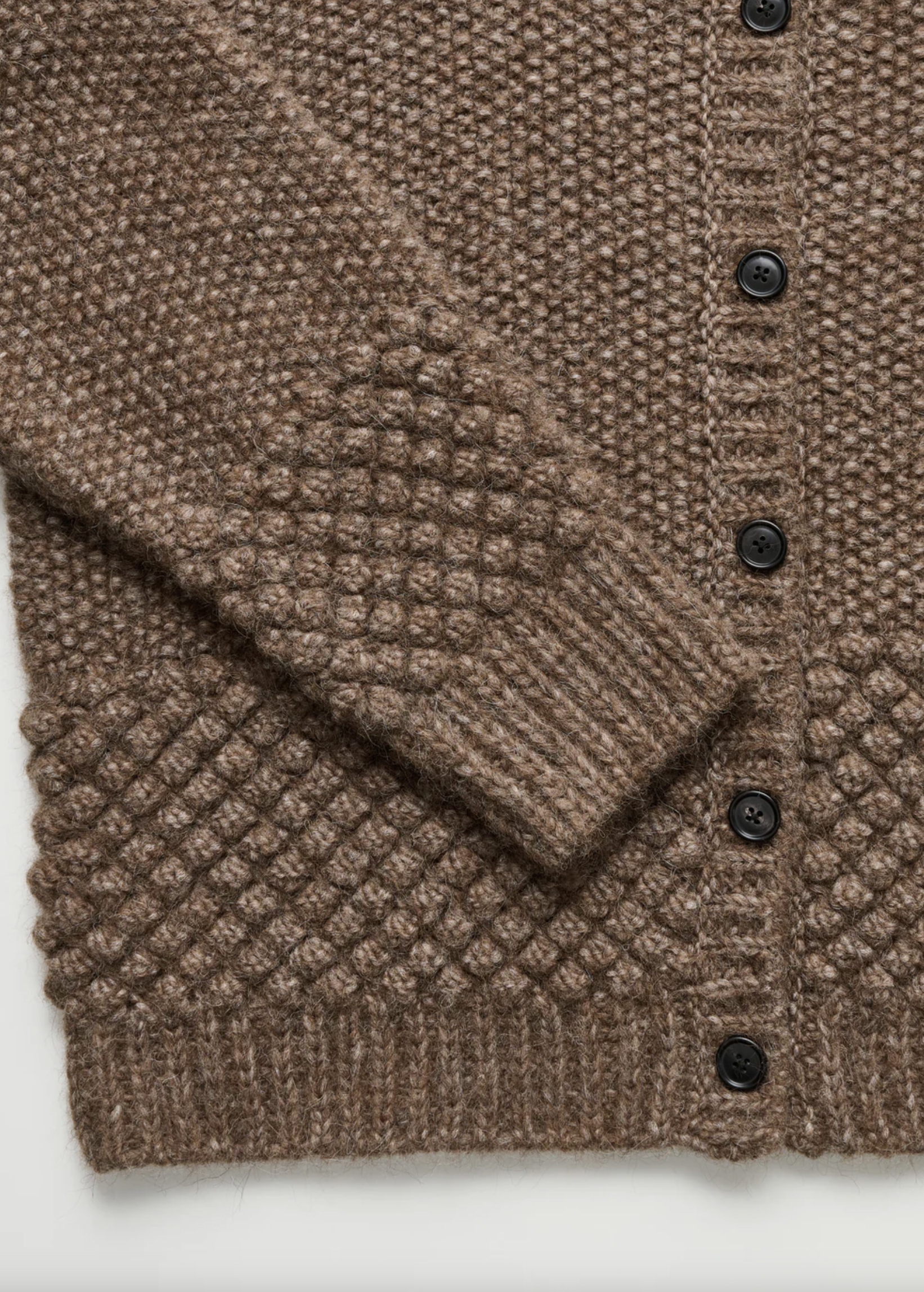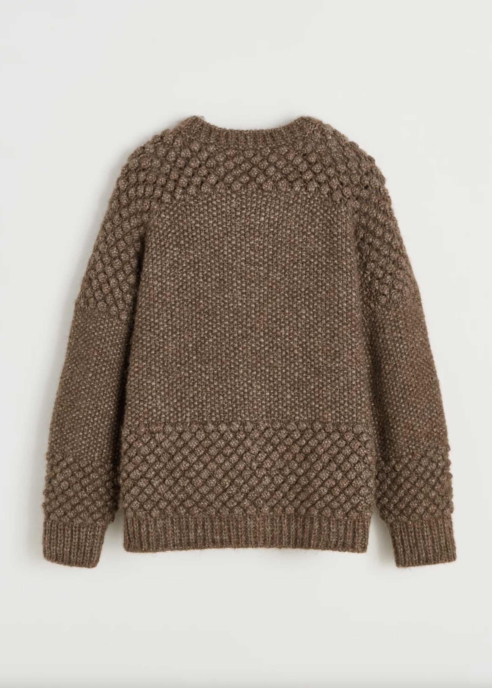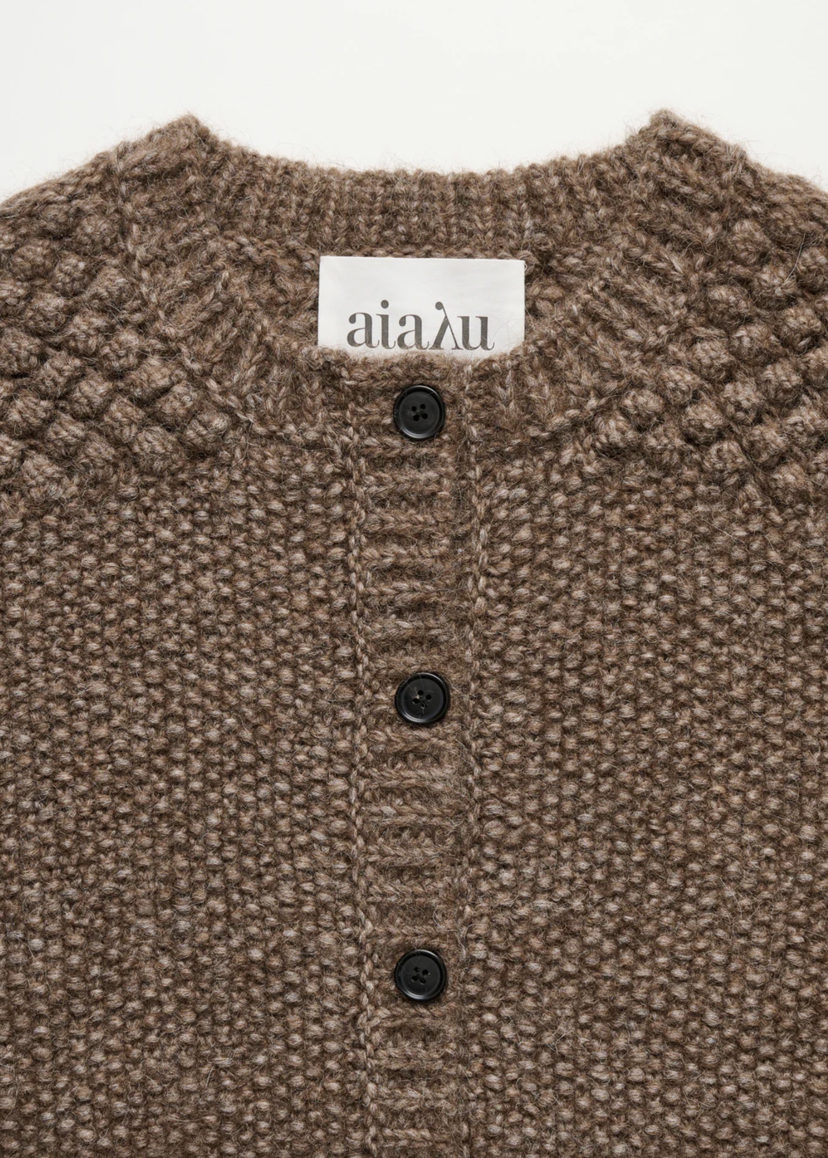 Puszysty, obszerny kardigan wykonany z niebarwionej, miękkiej wełny lamy. Ręcznie robiony na drutach o unikalnej strukturze, która łączy klasyczne techniki z wyrafinowanym splotem perłowym i delikatnymi, perłowymi detalami. Luźny krój z obniżonymi ramionami i ręcznie wykonanymi guzikami z rogu.