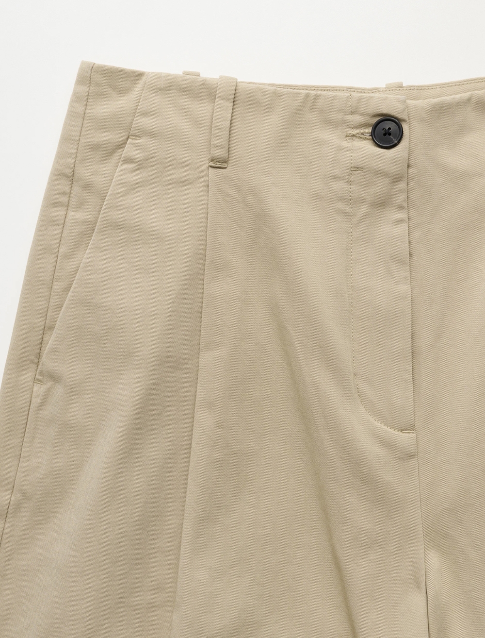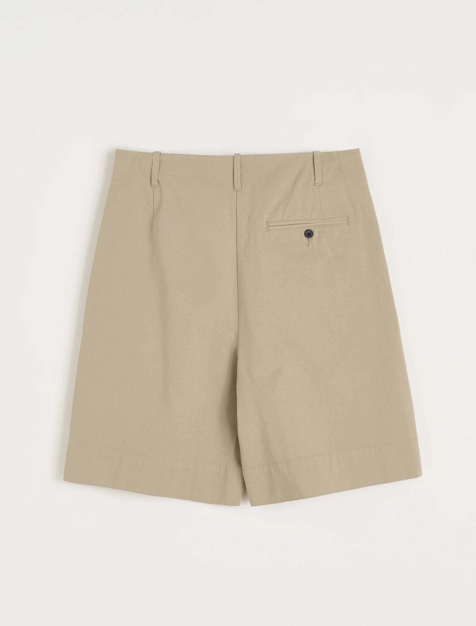 Spodenki mają ukośne kieszenie, szlufki do paska a także ręcznie robione rogowe guziki.