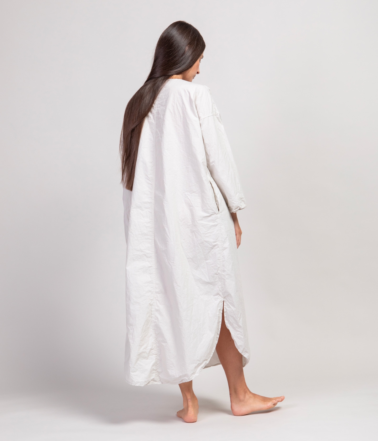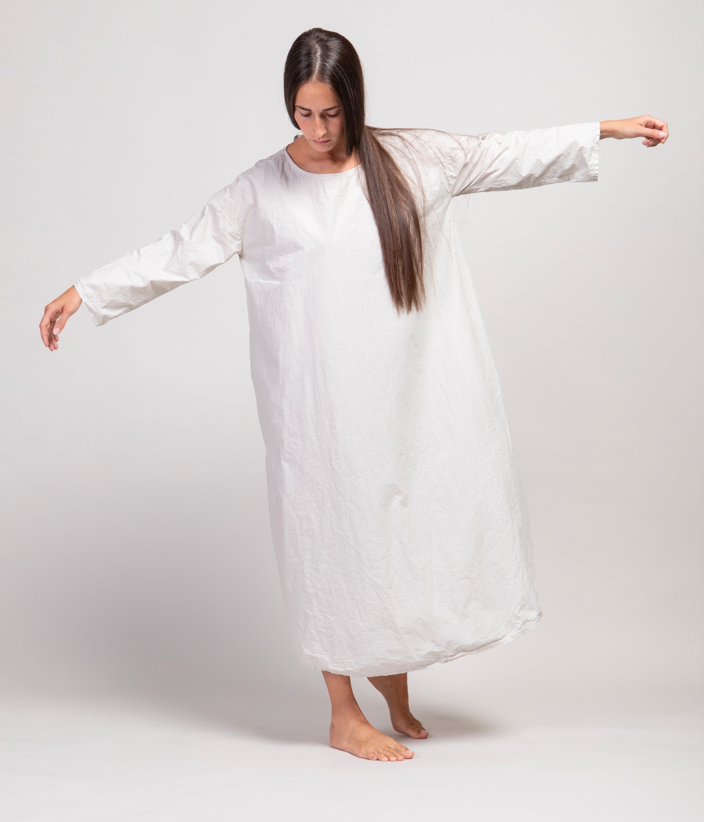 Sukienka z papierowej, lekkiej w dotyku bawełny o kroju T - shirt. Kieszenie w bocznych szwach, długi rękaw, rozcięcia po bokach umozliwiające swobodne chodzenie.